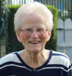 Sadly missed by her son Richard, daughters Anne, Lorraine and Amanda, daughter-in-law Alice, sons-in-law Tony and Bob, grandchildren Mark, Alan, Mollie, Cadhla, Tom, Giulia and Sara, sister Bridie, extended family, relatives, neighbours and her wide circle of friends.